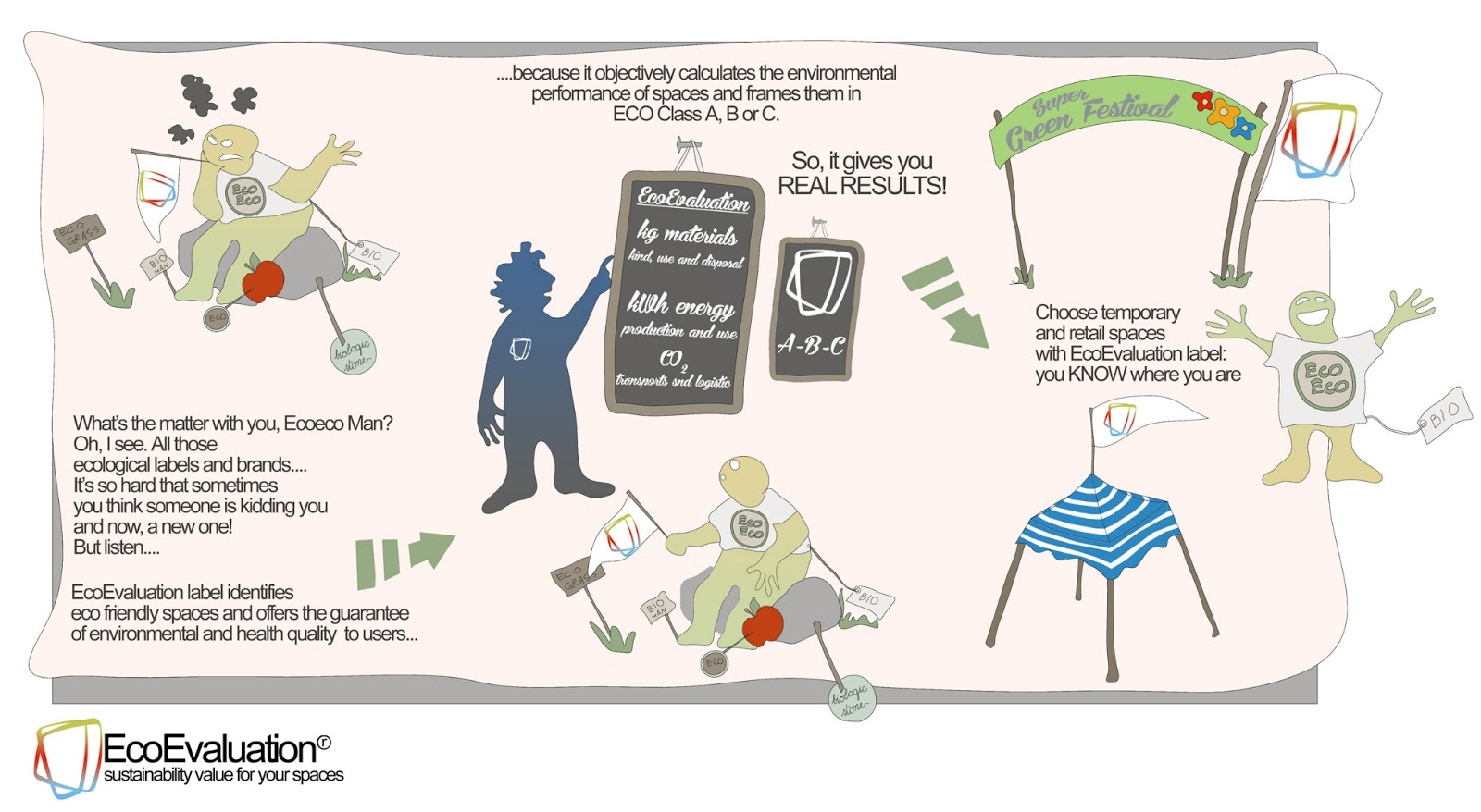 Gli spazi fiera e retail ecosostenibili con etichetta EcoValutazione offrono al committente ed al consumatore la possibilità di conoscere esattamente le caratteristiche ambientali del luogo dove si trovano. Grazie al metodo su cui è basata, EcoValutazione permette infatti la misurazione scientifica ed oggettiva della prestazione ambientale dello spazio realizzato, sia questo temporaneo (fiere, esposizioni, festival) che permanente (negozi, hotel, retail) e fornisce risultati reali in termini di consumi energetici, materiali ed emissioni. Una garanzia misurabile e facilmente comprensibile grazie al sistema delle ECO Classi.
